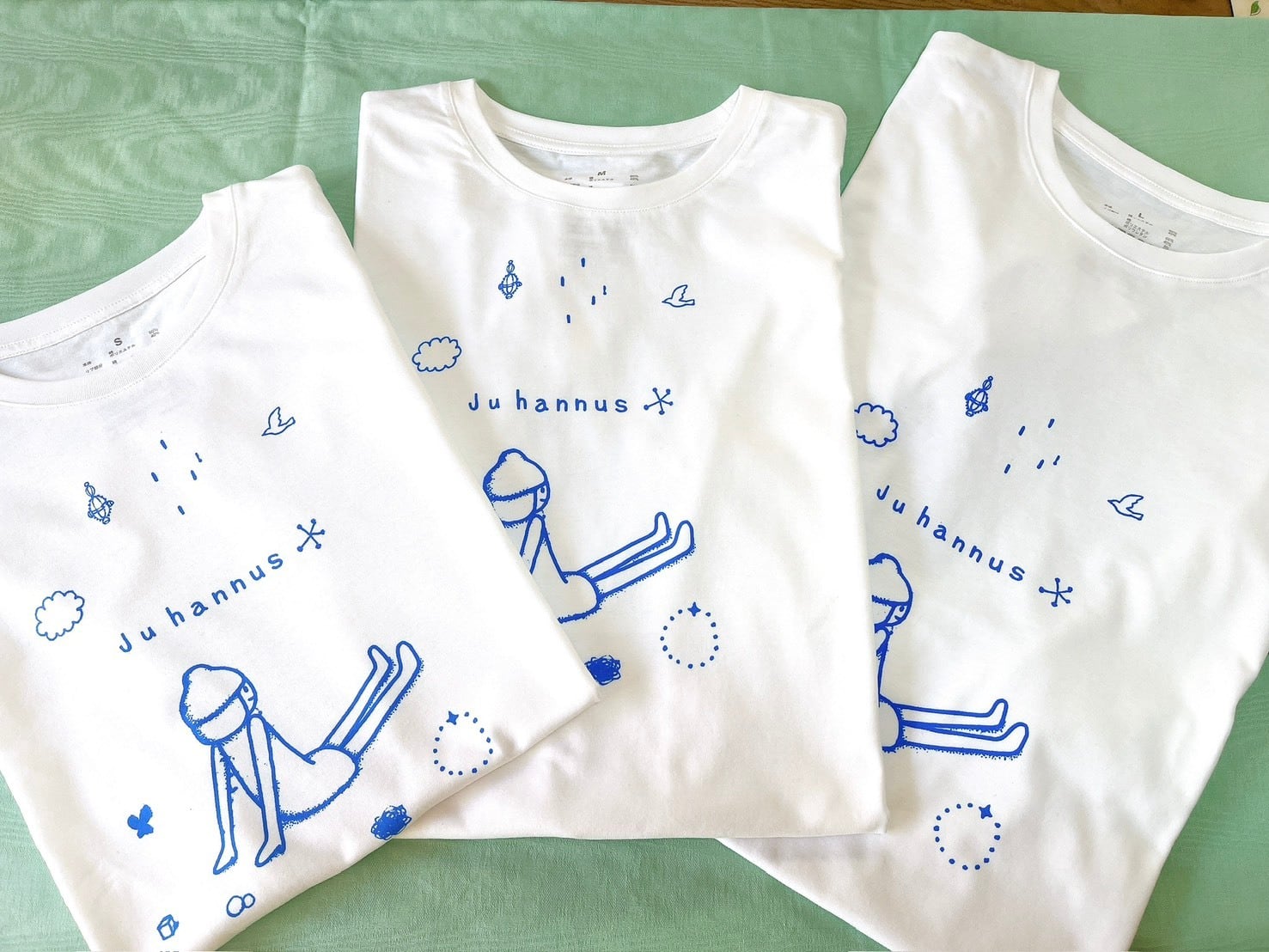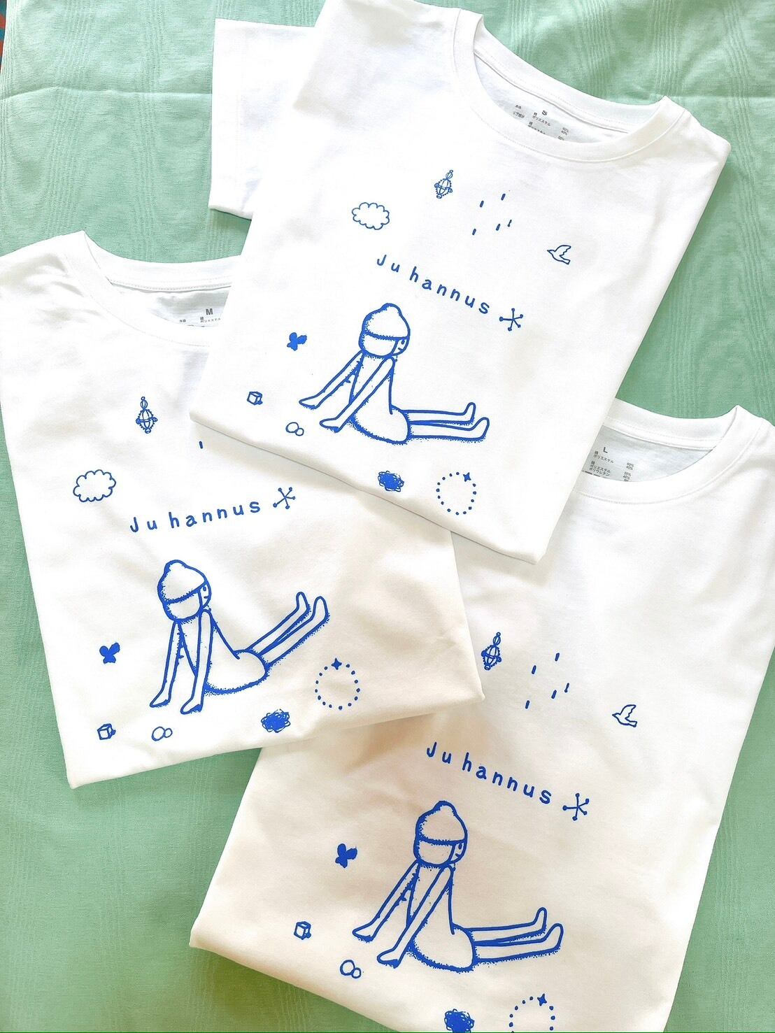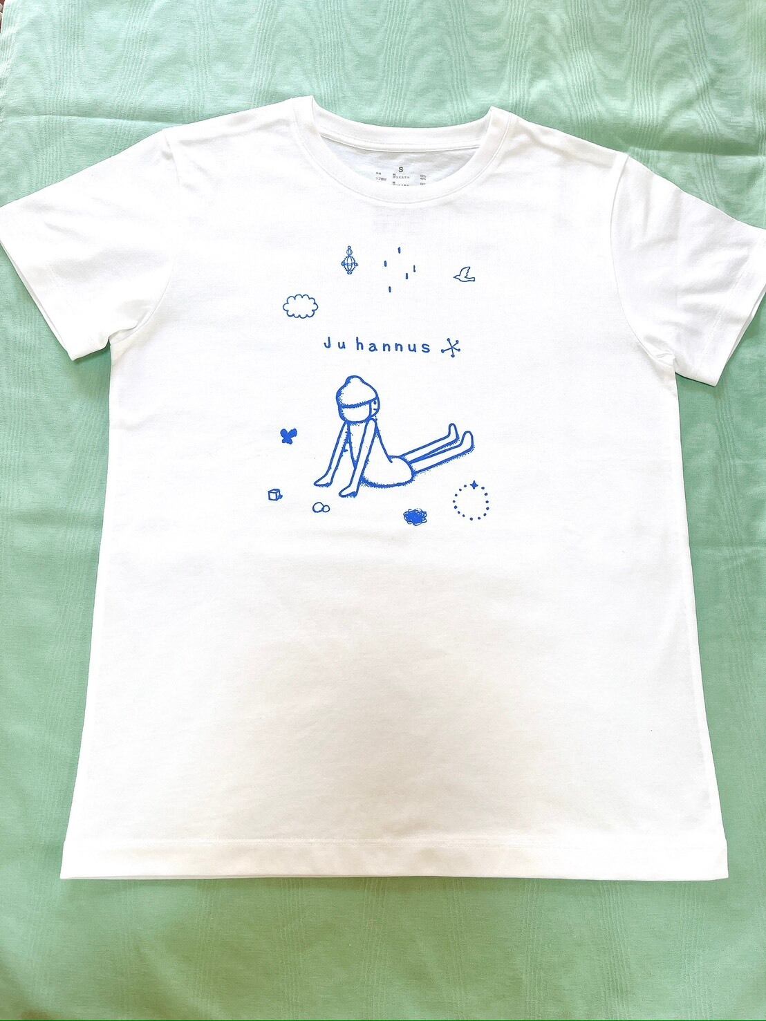 白色の生地にシルクスクリーンで作品をオリジナルで青色手刷りしています。